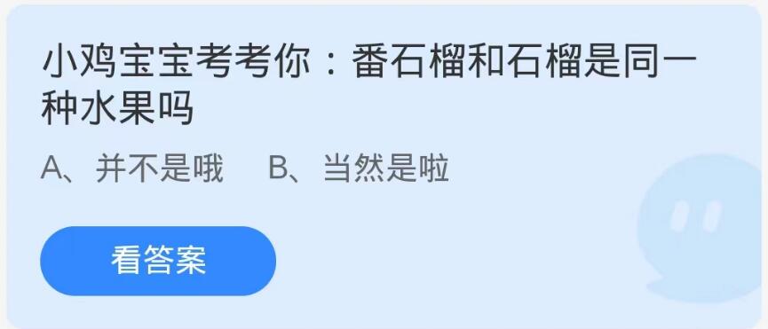 蚂蚁庄园10月26日问题:番石榴和石榴是同一种水果吗?很多小伙伴不知道番石榴和石榴是同一种水果吗,那么下面小编就为大家带来了蚂蚁庄园10月26日每日一题答案,感兴趣的快来了解一下吧。蚂蚁庄园今日答案汇