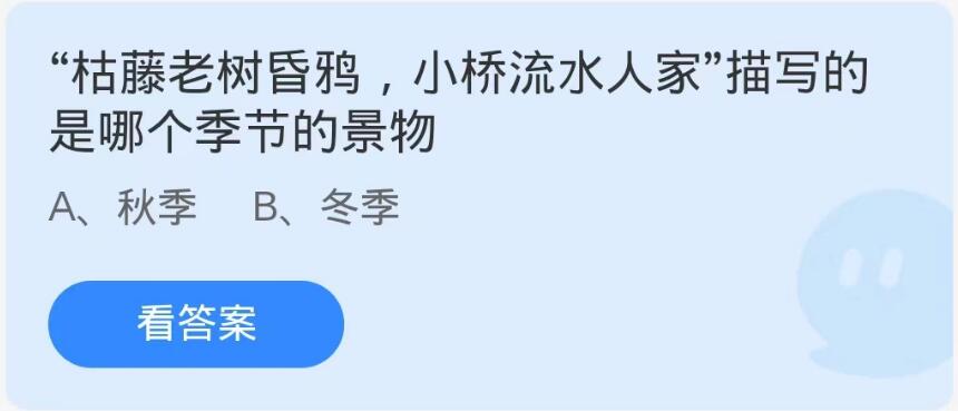 蚂蚁庄园10月21日问题:“枯藤老树昏鸦,小桥流水人家"描写的是哪个季节的景物?很多小伙伴不知道古藤老树昏鸦,小桥流水人家是描写哪个季节的景物,那么下面小编就为大家带来了蚂蚁庄园10月21日每日一题答