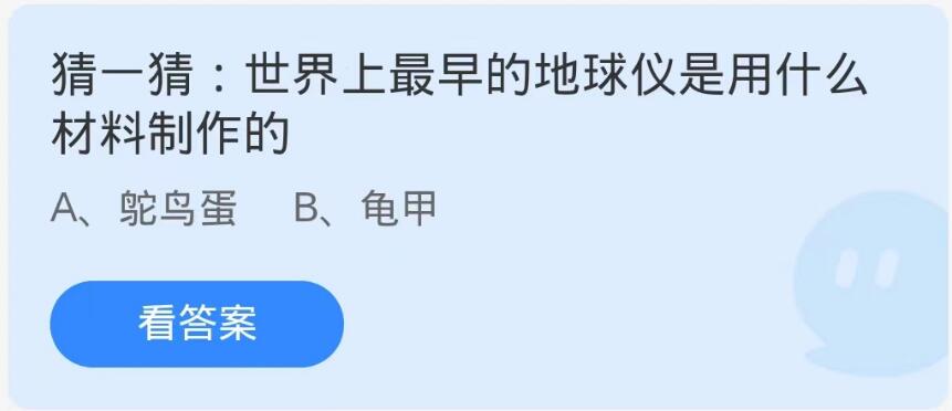 蚂蚁庄园10月14日问题:世界上最早的地球仪是用什么材料制作的?很多小伙伴不知道世界上最早的地球仪是使用什么材料制作的,那么下面小编就为大家带来了蚂蚁庄园10月14日每日一题答案,感兴趣的快来了解一下