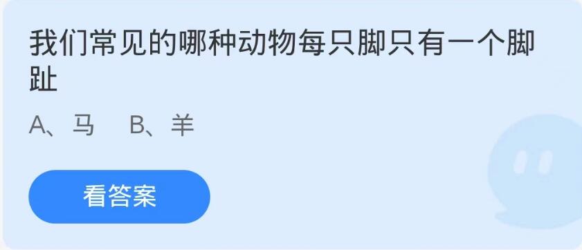 蚂蚁庄园10月11日问题:我们常见的哪种动物每只脚只有一个脚趾?很多小伙伴不知道我们常见的哪一种动物每只脚是只有一个脚趾,那么下面小编就为大家带来了蚂蚁庄园10月11日每日一题答案,感兴趣的快来了解一