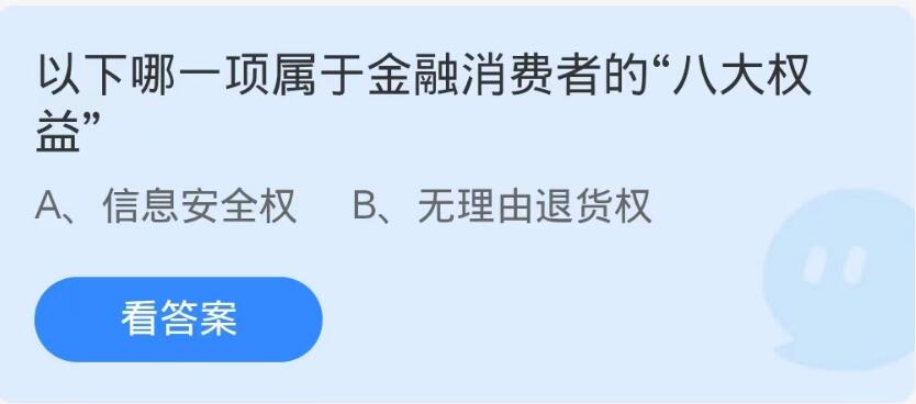 蚂蚁庄园10月11日问题:以下哪一项属于金融消费者的“八大权益”?很多小伙伴不知道哪一项是金融消费者的八大权益,那么下面小编就为大家带来了蚂蚁庄园10月11日每日一题答案,感兴趣的快来了解一下吧。蚂蚁