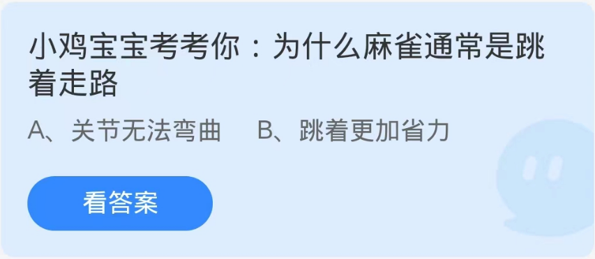 蚂蚁庄园10月7日问题:为什么麻雀通常是跳着走路?很多小伙伴不知道麻雀为什么通常跳着走路,那么下面小编就为大家带来了蚂蚁庄园10月7日每日一题答案,感兴趣的快来了解一下吧。蚂蚁庄园今日答案汇总蚂蚁庄园