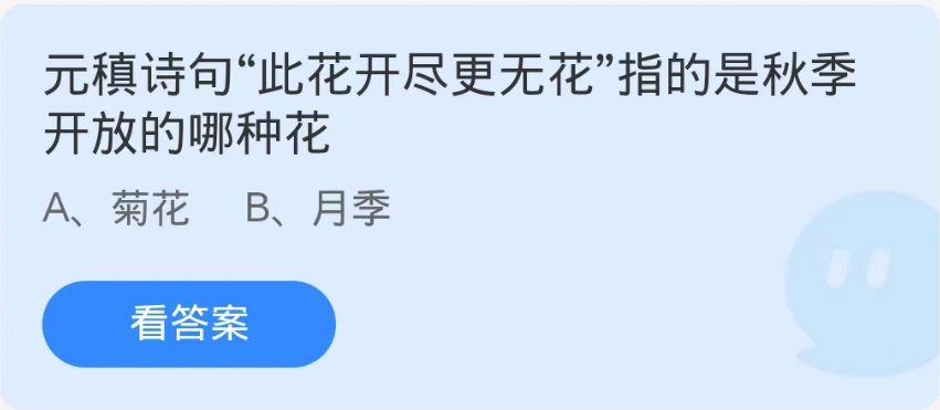 蚂蚁庄园10月7日问题:元稹诗句“此花开尽更无花”指的是秋季开放的哪种花?很多小伙伴不知道此花开尽更无花这句诗词是元稹想要指代的秋季哪一种花,那么下面小编就为大家带来了蚂蚁庄园10月7日每日一题答案,