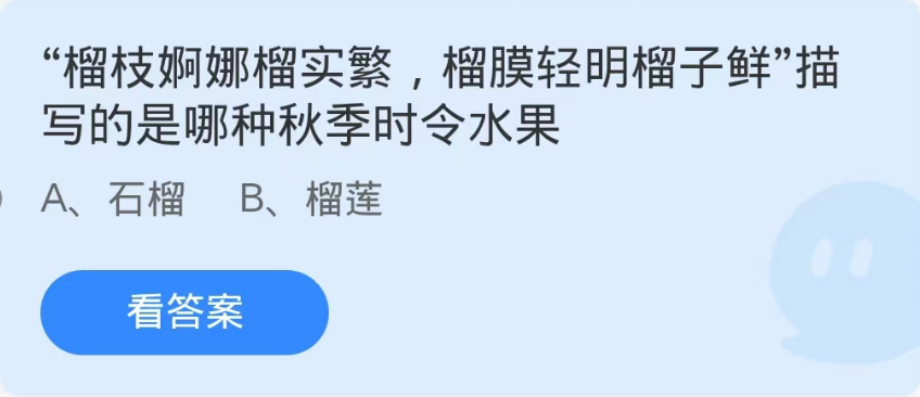 蚂蚁庄园10月2日问题:“榴枝婀娜榴实繁,榴膜轻明榴子鲜”描写的是哪种秋季时令水果?很多小伙伴不知道榴枝婀娜榴实繁,榴膜轻明榴子鲜这句是描写的秋季哪一种时令水果,那么下面小编就为大家带来了蚂蚁庄园10