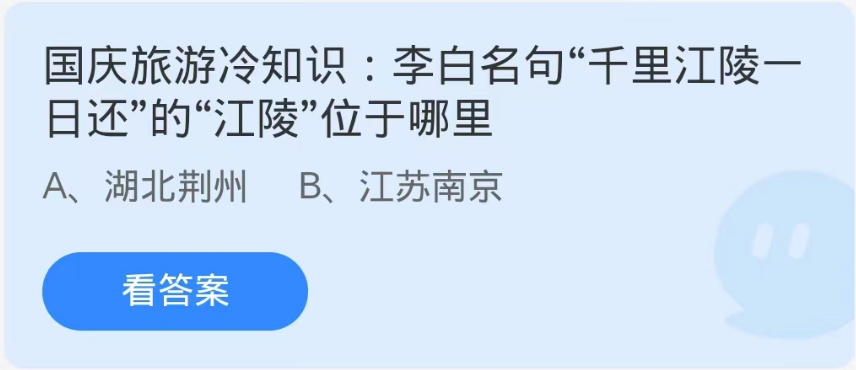 蚂蚁庄园10月2日问题:李白名句“千里江陵一日还”的“江陵”位于哪里?很多小伙伴不知道千里江陵一日还李白名句中的江陵位于哪里,那么下面小编就为大家带来了蚂蚁庄园10月2日每日一题答案,感兴趣的快来了解