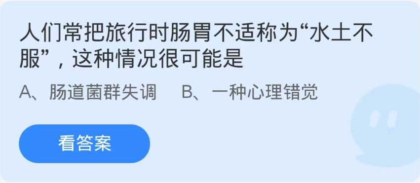 蚂蚁庄园10月1日问题:人们常把旅行时肠胃不适称为“水士不服”,这种情况很可能是?很多小伙伴不知道人们经常在旅行的时候肠胃不适被称之为水土不服这种情况是什么,那么下面小编就为大家带来了蚂蚁庄园10月1