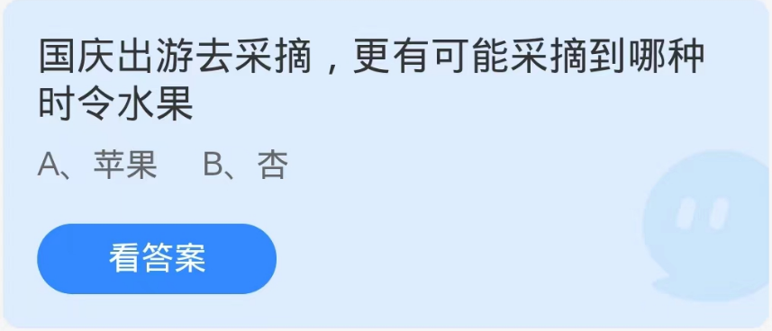 蚂蚁庄园10月1日问题:国庆出游去采摘,更有可能采摘到哪种时令水果?很多小伙伴不知道国庆出游去采摘更有可能采摘到的时令水果是什么,那么下面小编就为大家带来了蚂蚁庄园10月1日每日一题答案,感兴趣的快来