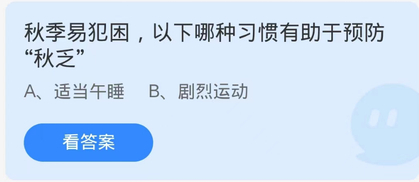 蚂蚁庄园9月25日问题:秋季易犯困,以下哪种习惯有助于预防“秋乏”?很多小伙伴不知道秋季容易犯困哪一种习惯是有助于预防秋乏,那么下面小编就为大家带来了蚂蚁庄园9月25日每日一题答案,感兴趣的快来了解一