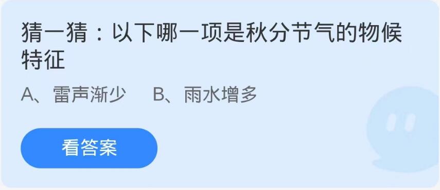 蚂蚁庄园9月23日问题:以下哪一项是秋分节气的物候特征?很多小伙伴不知道哪一个特征是秋分节气的提醒物候的,那么下面小编就为大家带来了蚂蚁庄园9月23日每日一题答案,感兴趣的快来了解一下吧。蚂蚁庄园今日