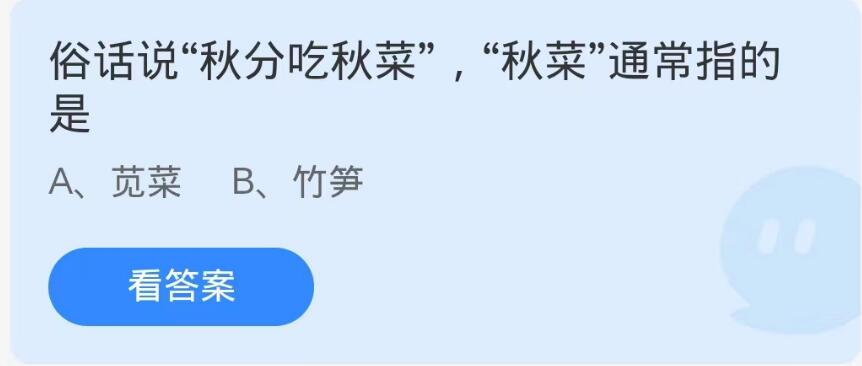 蚂蚁庄园9月23日问题:俗话说“秋分吃秋菜”,“秋菜”通常指的是?很多小伙伴不知道俗话说秋分吃秋菜中的秋菜通常是指什么,那么下面小编就为大家带来了蚂蚁庄园9月23日每日一题答案,感兴趣的快来了解一下吧