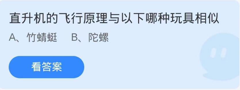 蚂蚁庄园9月20日问题:直升机的飞行原理与以下哪种玩具相似?很多小伙伴不知道直升机的飞行原理要和哪一种玩具是相似的,那么下面小编就为大家带来了蚂蚁庄园9月20日每日一题答案,感兴趣的快来了解一下吧。蚂