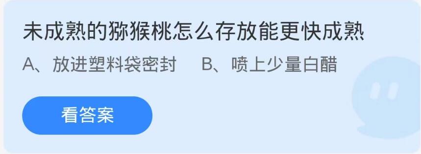 蚂蚁庄园9月21日问题:未成熟的猕猴桃怎么存放能更快成熟?很多小伙伴不知道没有成熟的猕猴桃是可以怎样存放可以更快的成熟,那么下面小编就为大家带来了蚂蚁庄园9月21日每日一题答案,感兴趣的快来了解一下吧