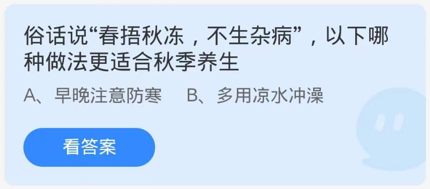 蚂蚁庄园9月21日问题:俗话说“春捂秋冻,不生杂病”,以下哪种做法更适合秋季养生?很多小伙伴不知道俗话说的春捂秋冻,不生杂病哪个做法更适合秋季养生的,那么下面小编就为大家带来了蚂蚁庄园9月21日每日一